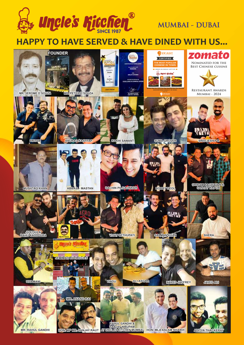 WE ARE OPEN IN AL KARAMA, DUBAI. "Uncle's Kitchen” - A Timeless Legacy of Indo-Chinese Cuisine since 1987. From the Nook of Mumbai to the Heart of Dubai, Uncle's Kitchen has been a beacon of culinary excellence for over three decades. Our journey began in 1987, in the vibrant city of Mumbai, where our founder Jerome D’Souza pioneered the concept of Indo-Chinese cuisine. Today, we proudly bring our legacy to Dubai, where we continue to serve our signature dishes with the same love, care, and dedication that has defined our brand. As we embark on this new chapter in Dubai, remaining true to our roots, We believe that food has the power to bring people together, and we're honored to be a part of so many special memories together. Team UK